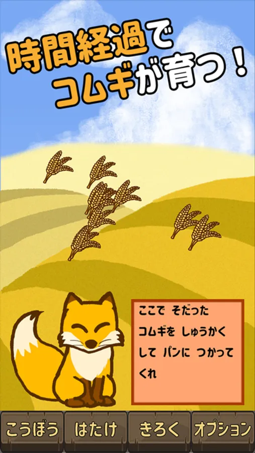 ・一定時間が経過すると畑にコムギがどんどん育っていく!だれでもいつでも楽しめる放置ゲーム!平日のスキマ時間でも休日の長い時間でも、暇つぶしにピッタリ