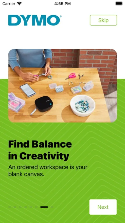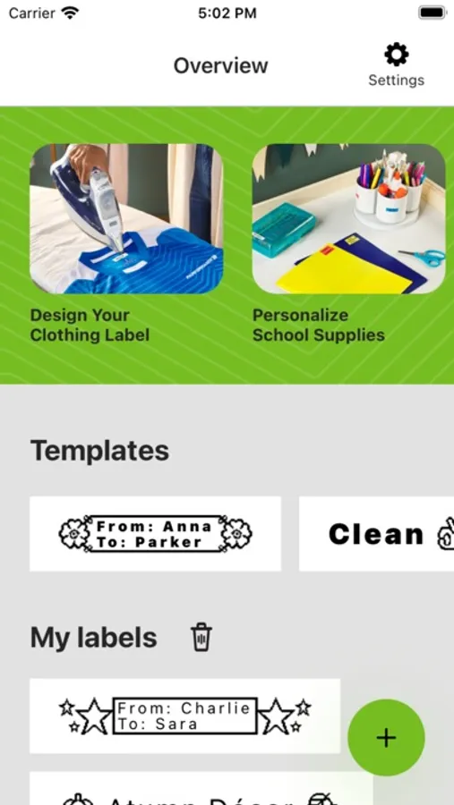 Home screen includes 8 pre-saved templates, helpful tips and tricks and the option to create and save personalized labels.