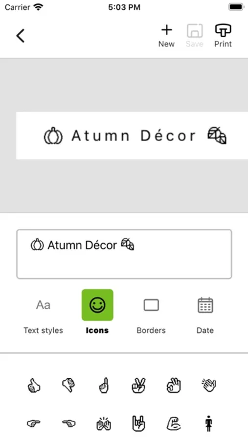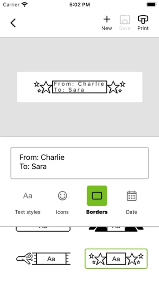 Customize labels with options including 5 font sizes, 15 box styles, 100+ icons, and the ability to underline, create multiple lines of text, or insert a date.