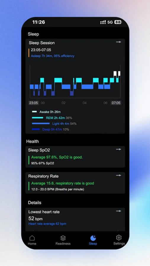 See your sleep stages — REM, deep, light — and discover your ideal bedtime.