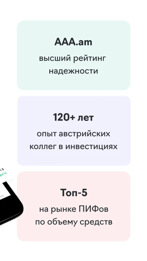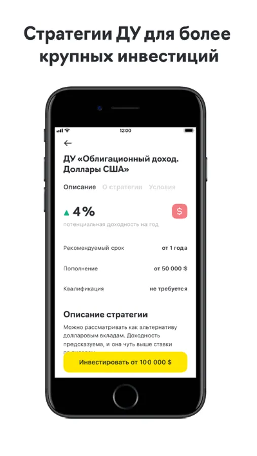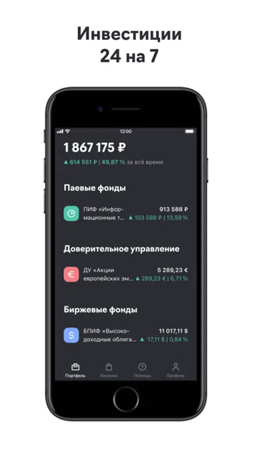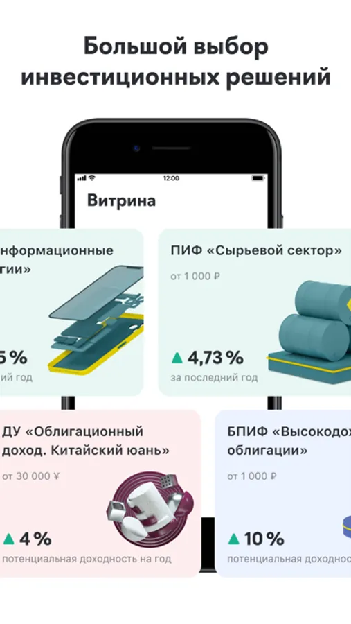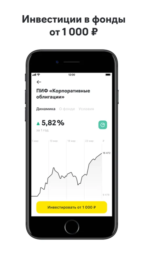 В приложении можно инвестировать от 1 000 ₽ в ПИФы с акциями, облигациями и золотом. Для более крупных инвестиций есть стратегии доверительного управления. Всё происходит онлайн — посещать офис банка не понадобится.