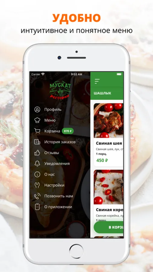 Приложение Мускат — это удобный способ заказа еды домой или в офис!