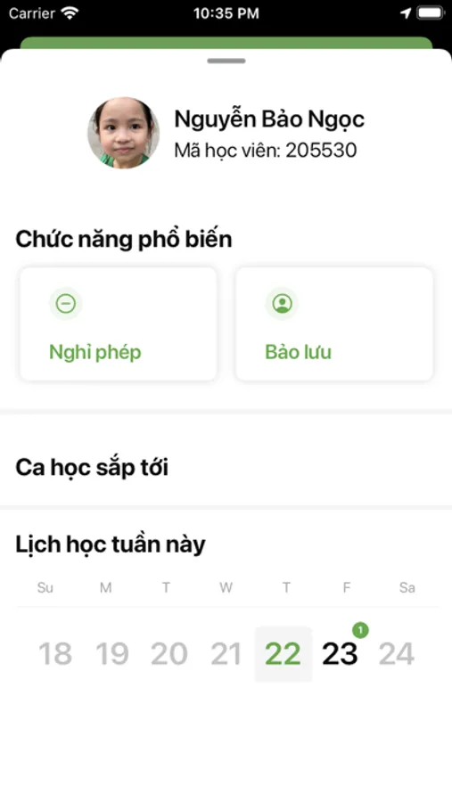- Thuận tiện trong việc quản lý và theo sát tiến độ học của con: Thông tin điểm danh theo lớp học, Xin nghỉ phép và học bù cần thiết, Chuyển lớp và Bảo lưu theo nhu cầu...