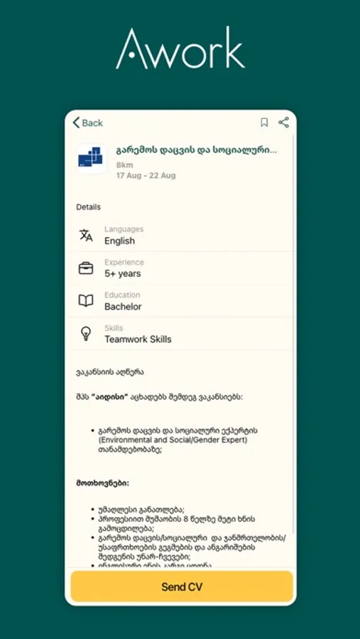 Awork is a first ever Georgian Job-Seeker application, that helps people to find proper jobs based on their preferred locations, from search to apply and simplifies entire process of finding a new job.