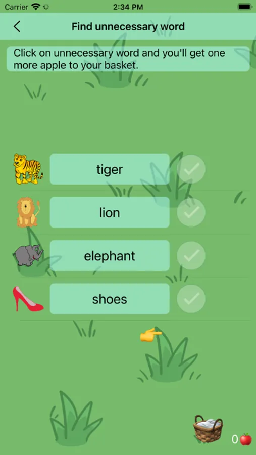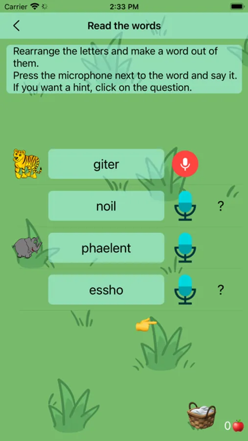 Other levels help to improve the reading technique with the help of anagrams - words with rearranged letters. You need to rearrange the letters and make words from them. A speech recognizer is used. Hints are pictures.