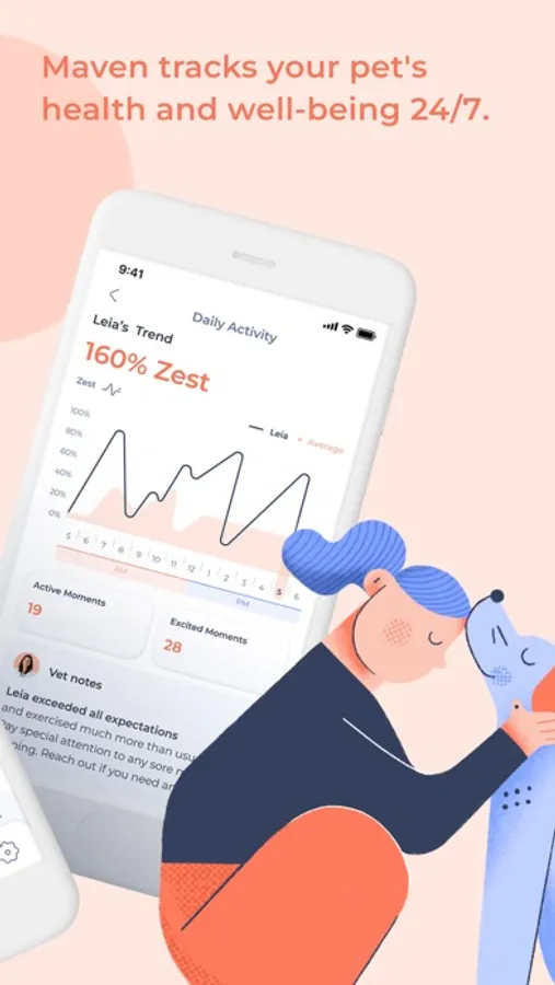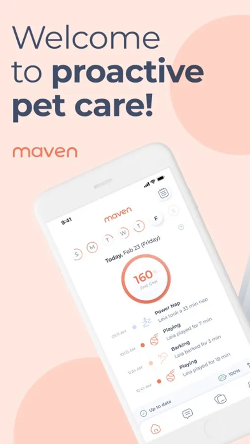 Welcome to proactive pet care! Maven tracks your pet's health and well-being 24/7. The Maven Vet Team continuously analyzes their data and behavioral patterns to give you tailored insights that effectively improve your pet's life, and ultimately, their happiness. Because they're part of the family, too.