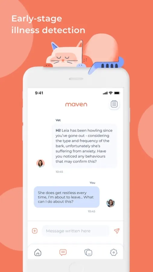 Maven continuously monitors your pet's well-being through accurate activity and behavior tracking. Your Maven vet is always on top of the situation, and so are you - if something's wrong, you'll immediately know about it, how it's affecting your buddy, and what to do next.