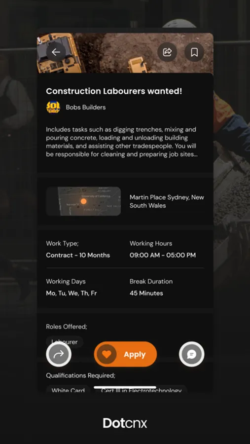 Dotcnx is a recruitment app that allows job providers and job seekers to connect for the purposes of employment. Employer benefits - Instant access to thousands of local trades and labourers for free. ability to post jobs for specific trades. swipe and list function to connect or decline candidates. algorithm built in to find the most suitable candidates. shortlist feature to create a pool of candidates that you're interested in. Instant messaging access to candidates that have applied for your job. ability to make multiple job post and switch between pools of candidates. rating feature to give employees a review on how well they done the job. ability to review candidates rating from previous employers.