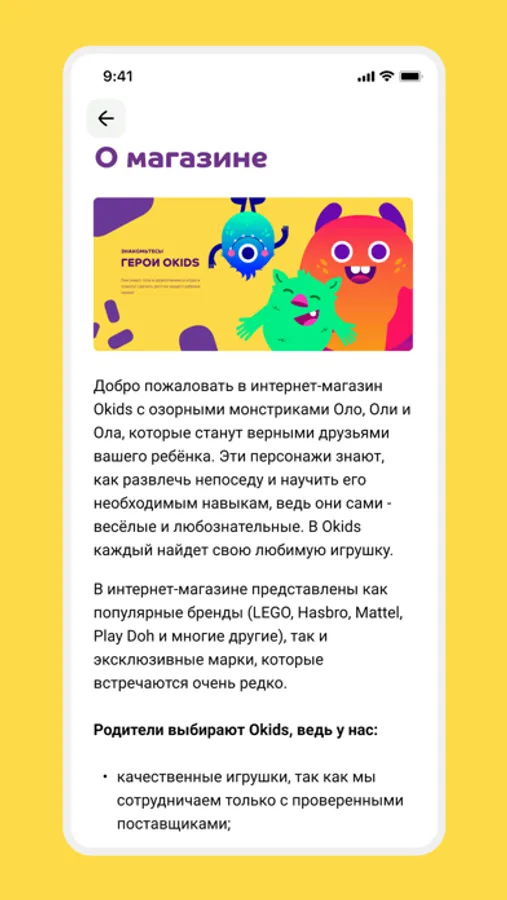 Все любимые детские товары будут всегда под рукой! С помощью мобильного приложения Okids вы можете заказать качественные и эксклюзивные игрушки по привлекательным ценам. А монстрики Ола, Оли и Оло подскажут, что лучше купить для мальчиков и девочек.