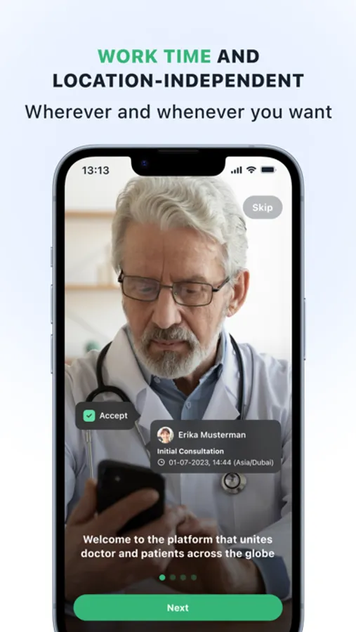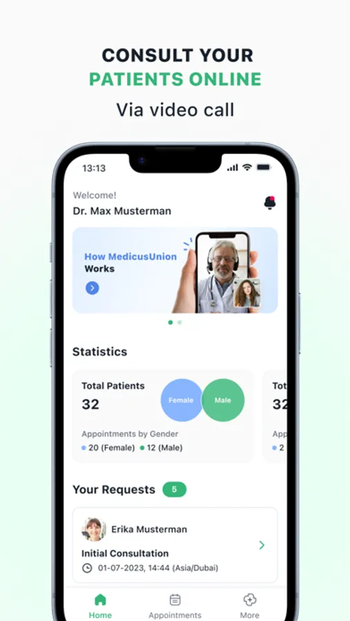 MedicusUnion revolutionizes the healthcare industry and supports doctors in digitizing their services and optimizing their time management. As a member, you will receive automatic appointment notifications through our app and can easily consult with your patients from any location in the world. With our user-friendly communication format, you can not only conduct online consultations but also interact directly with your patients through an integrated chat.