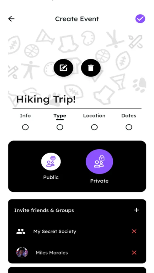 * Being that one solution to ugly group chats and cancelled plans! Uniconn lets its users create private events, so that you and your friends can enjoy being on the same page about every plan you make!