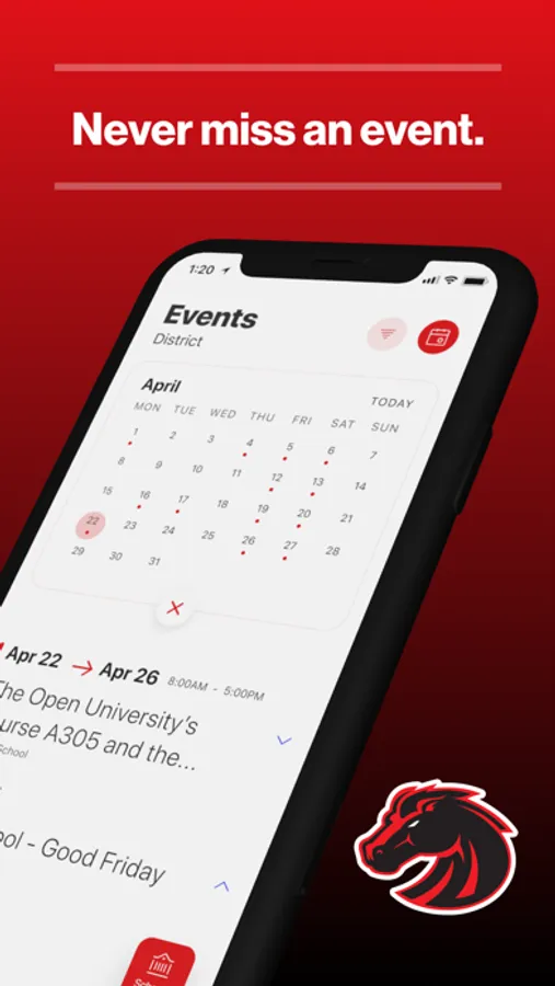 The event section shows a list of events throughout the district. Users can add an event to their calendar to share the event with friends and family with one tap.