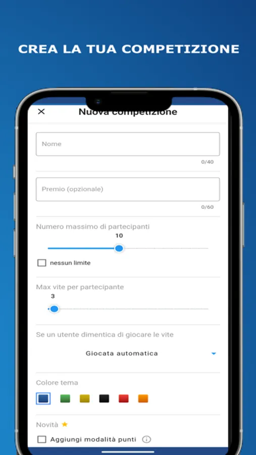 Puoi creare e personalizzare la tua competizione tramite la sezione dedicata dell'app, dopodiché ti basterà condividere il codice identificativo con chiunque vorrà registrarsi.