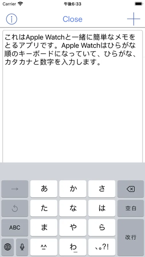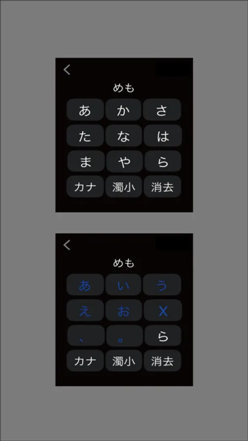 This is a memo app with Japanese language. On your Apple Watch, use the Hiragana table keyboard to enter words.