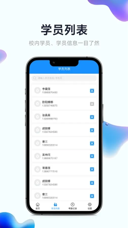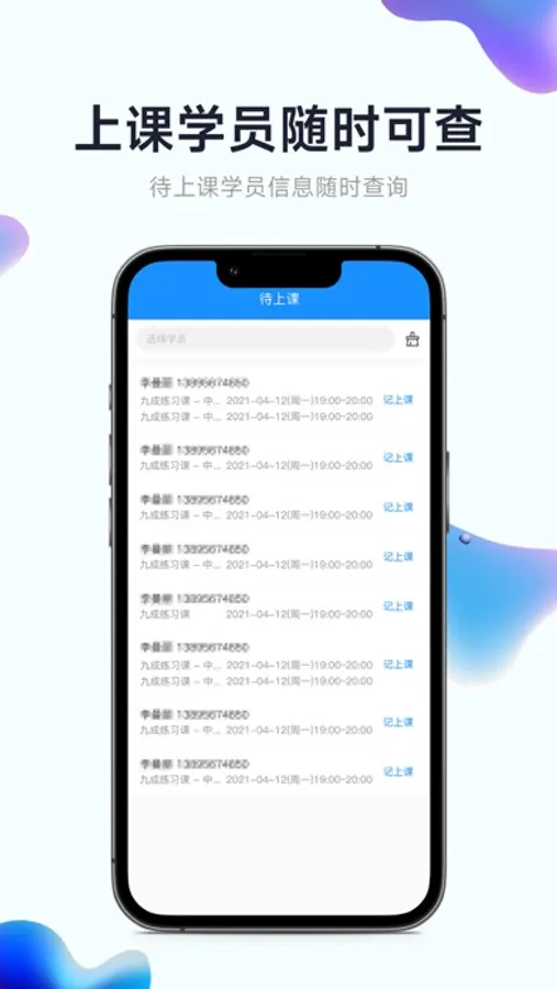 老师可在手机通过老师端对当前教学课程进行一键点名操作,也可 针对单独学员进行单次点名,学员请假、迟到、到课、未到等状态 方便老师对学员到课状态记录,手机点名后自动生成点名记录,方 便老师在手机端随时查询学员到课情况。