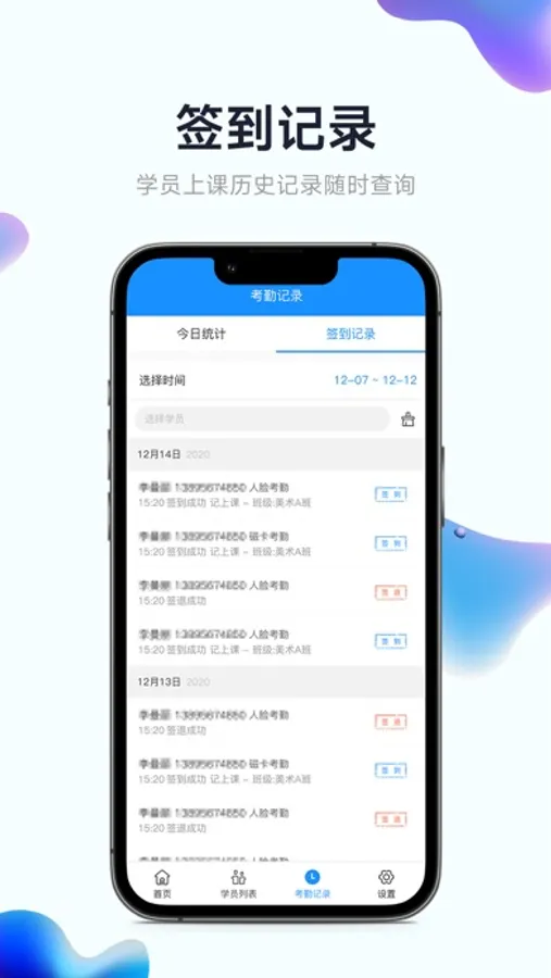 支持线上请假补课,有效管理学员考勤。学员请假情况详细罗 列,方便整理、查询,简单操作即可完成,学员状态清晰呈现。提升管理效率及服务质量。