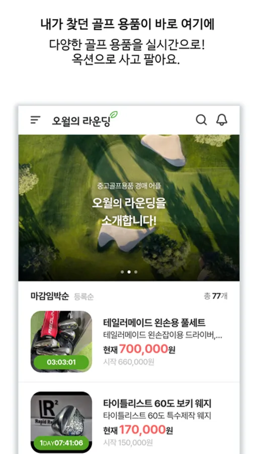 오월의 라운딩 만의 유일한 옥션 거래방식을 통해 전국의 골퍼분들과 자유로이 골프관련 용품을 즐겁게 거래하세요.