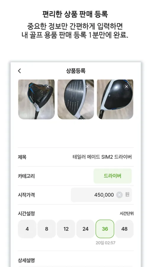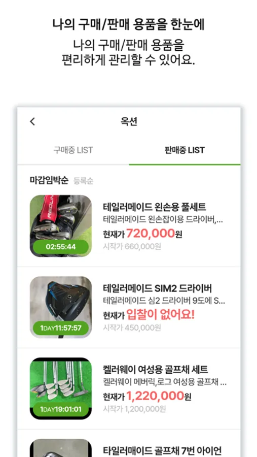 누구나 가지고 있는 중고 골프클럽/골프용품/골프의류/골프신발 등을 원하는 최소 시작가로 판매 등록할 수 있습니다.
