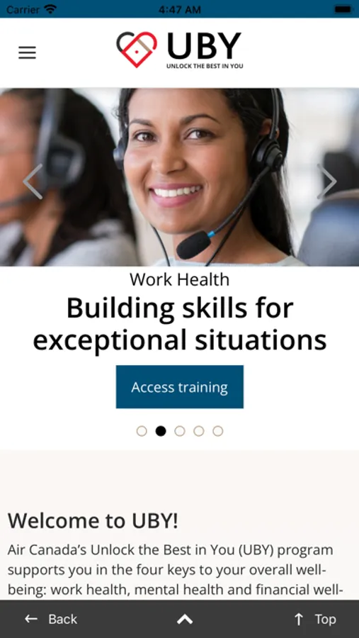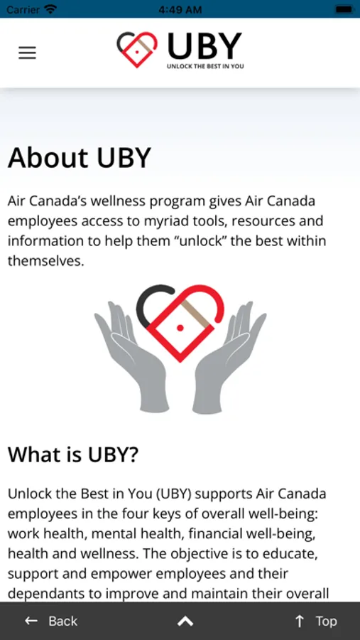 The AC UBY is a mobile-optimized companion app to the Unlock the Best in You (UBY) wellness platform. Users can keep up to date on all Air Canada wellness activities, interact with other participants and track personal wellness progress.