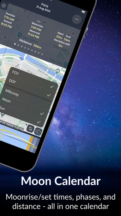 Visualize solar and lunar data anywhere on the map. Whether planning in advance or seeking real-time data, get pinpoint information to position your camera perfectly.