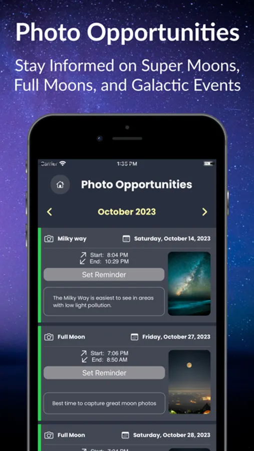 Never miss a celestial event again. With our dedicated section, you're in the loop for all upcoming photography events. Whether it's the awe-inspiring super moon, a luminous full moon, or once-in-a-lifetime galactic events, Sun Moon Expert ensures you're always prepared to capture these moments.