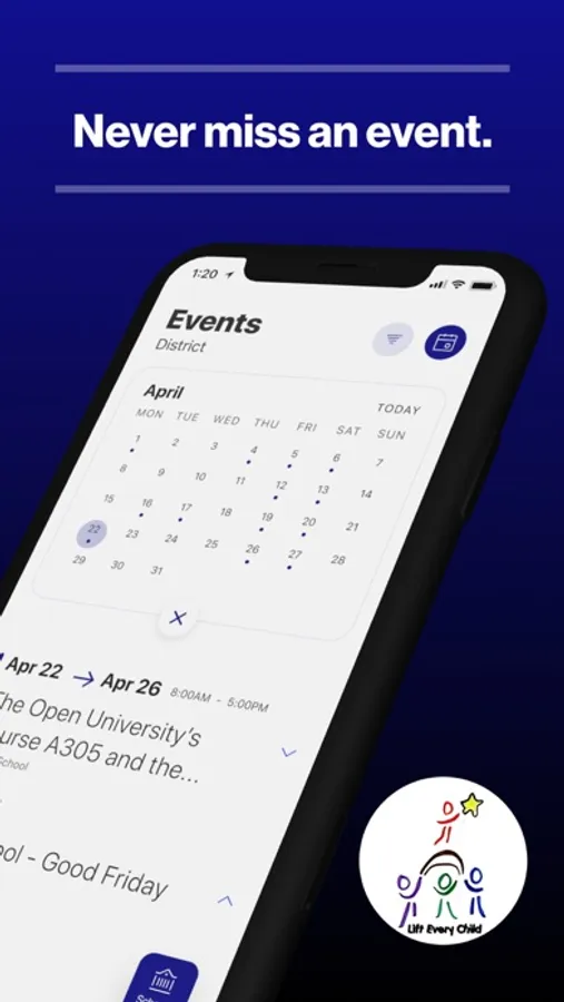 The event section shows a list of events throughout the district. Users can add an event to their calendar to share the event with friends and family with one tap.