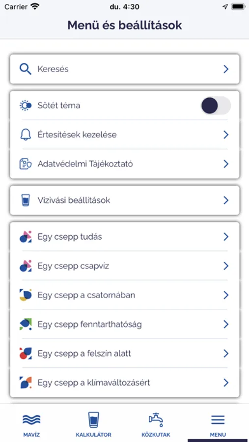 Az applikáció segít abban, hogy még környezettudatosabb legyél – legyen szó víz- vagy csatornahasználatról; a klímaváltozásról vagy a felszín alatti vízkészleteinkről.