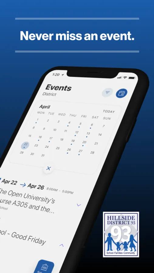 The event section shows a list of events throughout the district. Users can add an event to their calendar to share the event with friends and family with one tap.