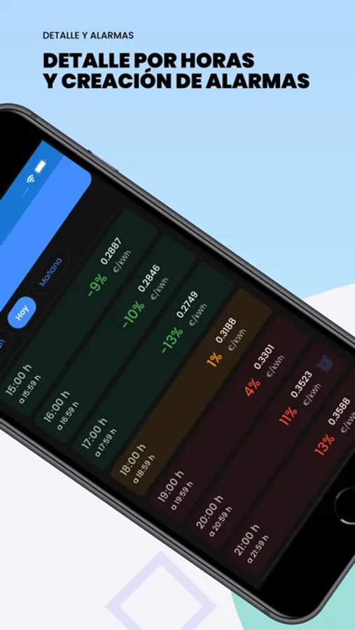 Consulta los precios por hora en €/kWh y en % respecto del precio medio del día
