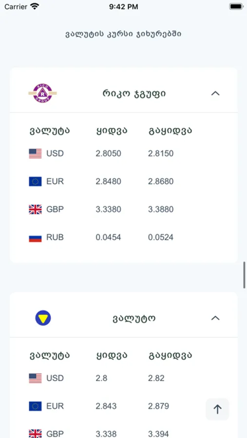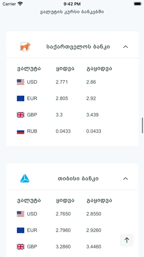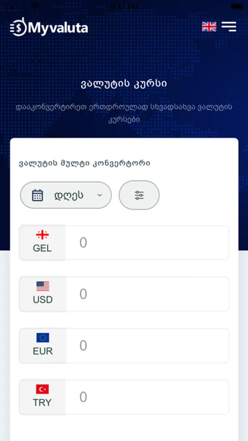 The application Myvaluta presents a platform where it is possible to view currency exchange rates in one space, both the National Bank of Georgia rates and banks and booths! You can easily convert the desired currency into 43 different currencies simultaneously with us. In addition, you can see charts of exchange rates for past periods, weeks, months, and years. You also have the opportunity to get acquainted with cryptocurrency courses in live mode.