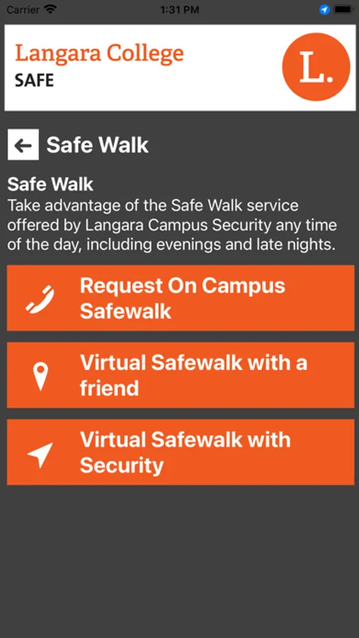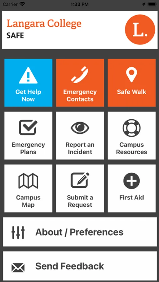 Langara Safe is the official safety app of Langara College. It is the only app that integrates with Langara College's safety and security systems. Campus Security has worked to develop a unique app that provides students, faculty and staff with added safety on the Langara College campus. The app will send you important safety alerts and provide instant access to campus safety resources.