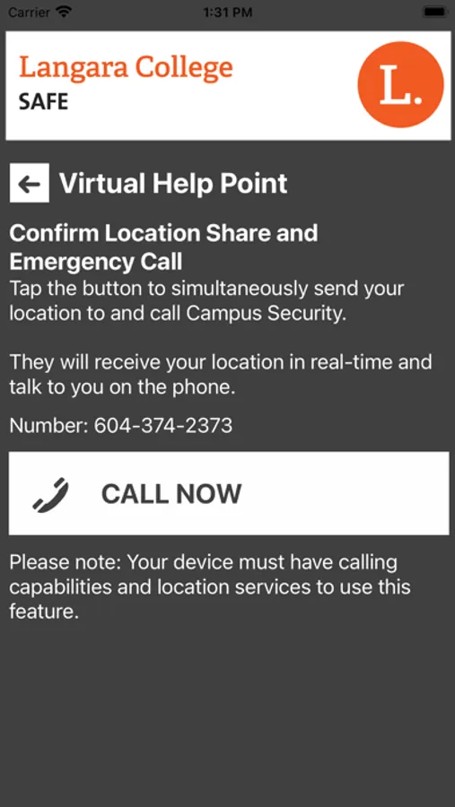 - Get Help Now: Send your location to Langara College security in real-time in case of a crisis