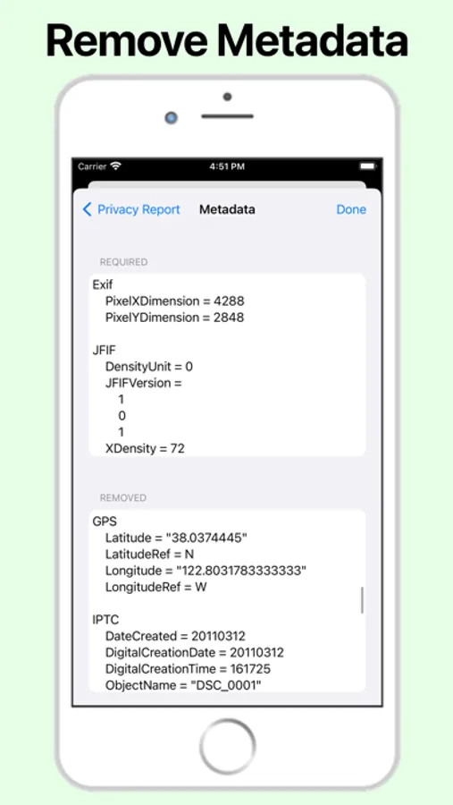 • Removes tracking metadata - including date, time, location information (GPS coordinates), camera settings, equipment, operating system, editing software and more.