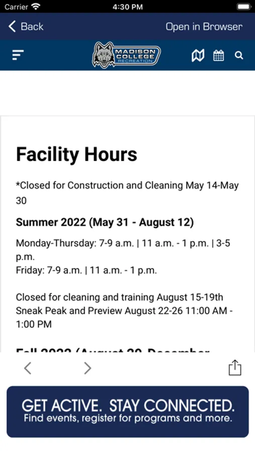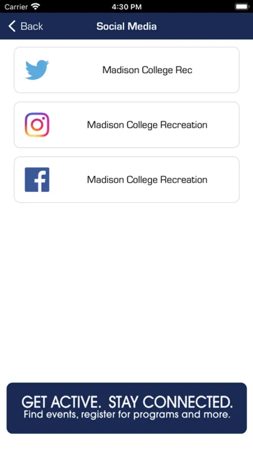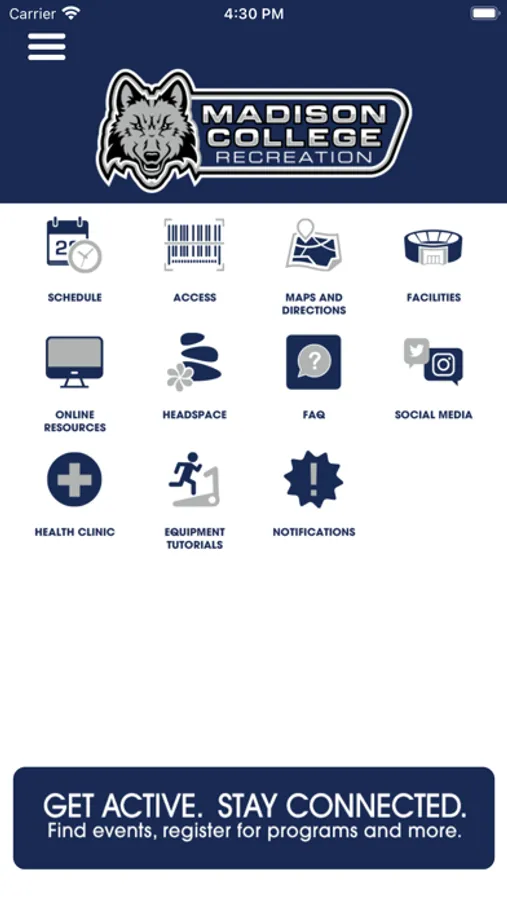 The Madison College Receation App will allow you to access the Truax Fitness Center, view facility hours, search for program offers and access resources available to Madison College Students and Employees
