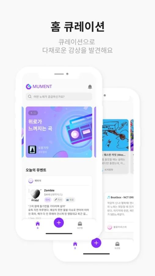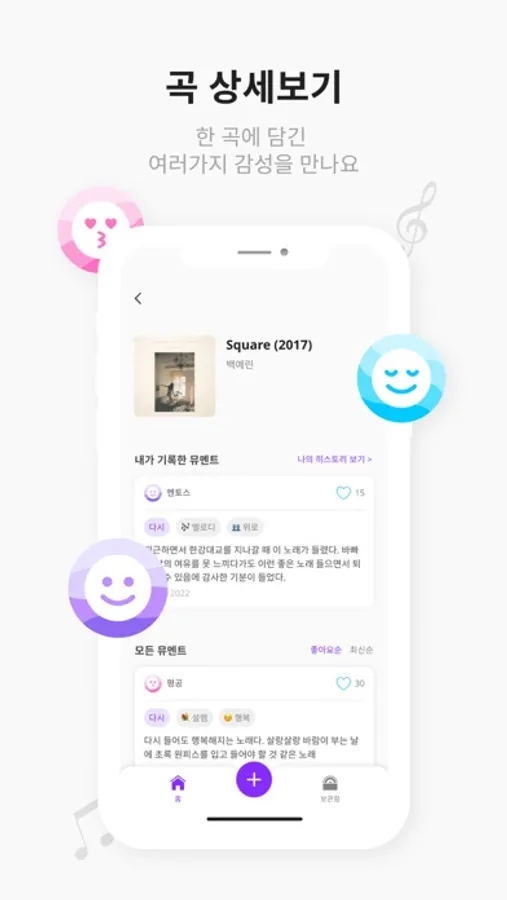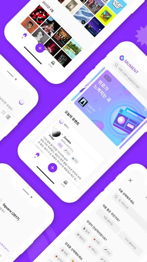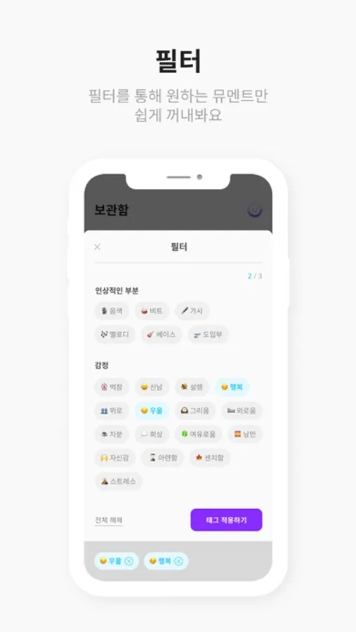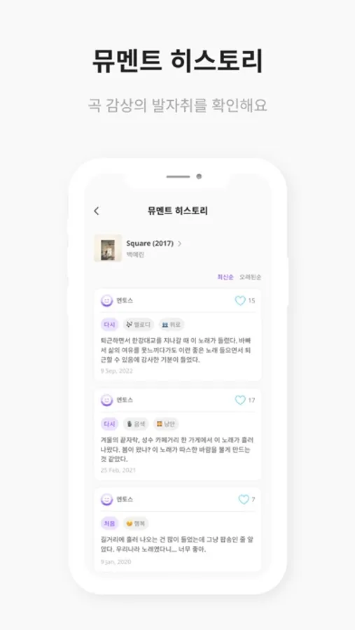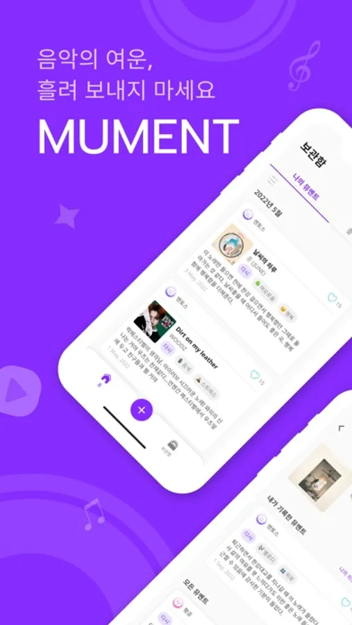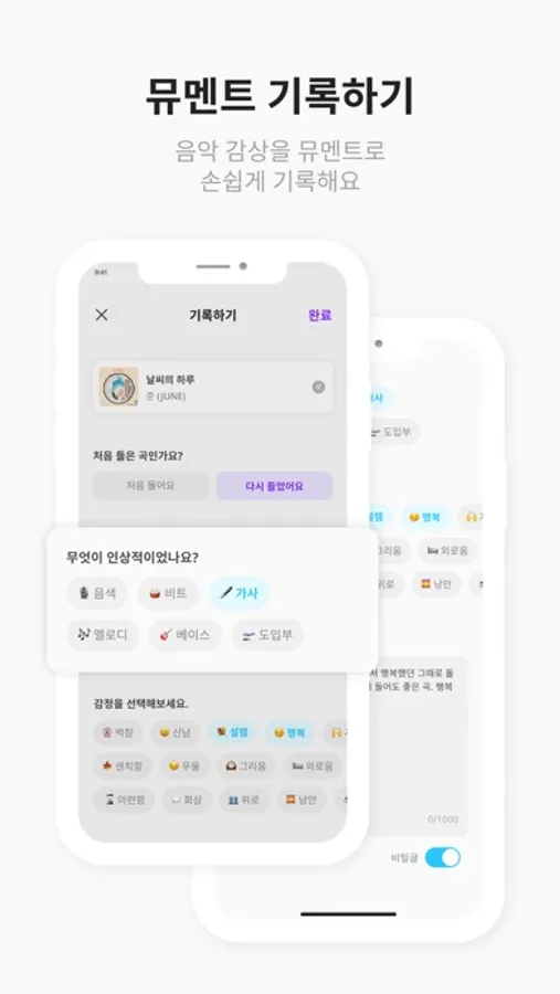 - 뮤멘트 기록하기: 음악 감상을 인상적인 부분과 감정 태그를 남겨 손쉽게 기록해요.