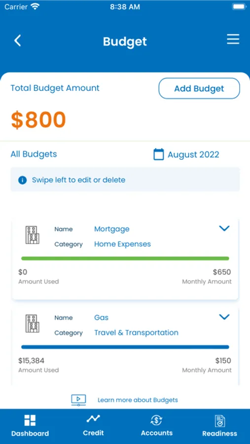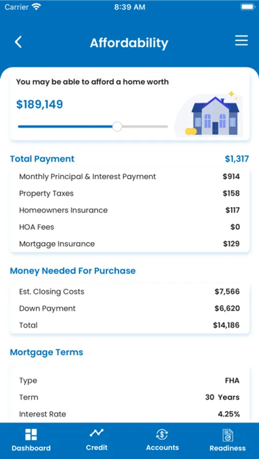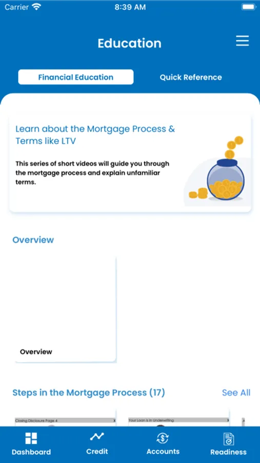 Work with your financial partner or institution to best prepare you for home ownership by planning for a down payment, establishing reserves, managing your debt to income ratio, improving or maintaining your credit, loan scenarios through our calculators, establish your projected loan to value, and more. Visit the readiness assessment in your app to see a snapshot of your credit overview, debt to income ratio, cash reserves, employment, down payment and sales price.