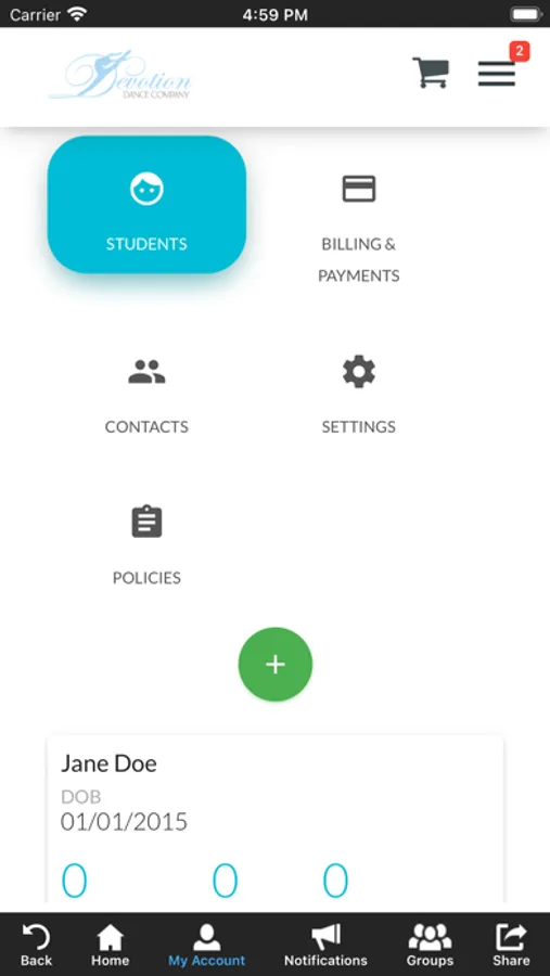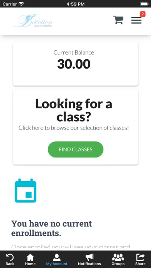 The Devotion Dance Company app allows you to manage your account with ease, register for classes, view your account balance and stay in constant touch with the studio. You'll also receive important notifications about class changes, closings, registration openings, special announcements, and upcoming events.
