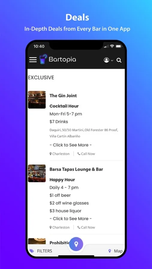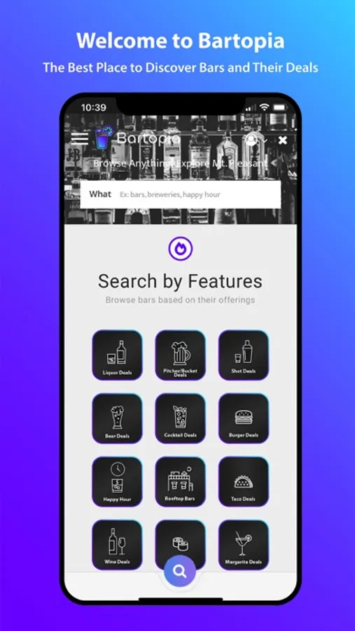 Bartopia is a discovery tool showcasing deals and specials at hundreds of bars in your city. Find any experience you're looking for and save money doing it. Simply search deals and happy hours, and you will find the best results at the bars and restaurants near you!