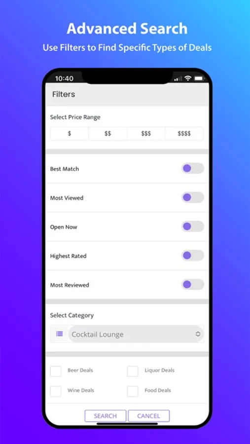 • Browse types of deals (ex. Brunch, Margaritas, Beer, Pizza)