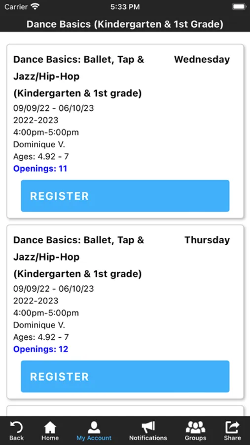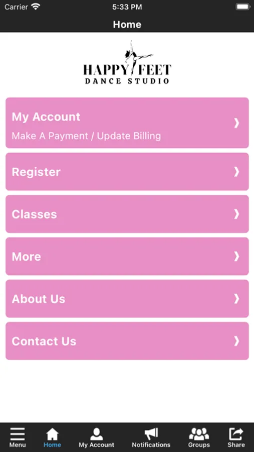 The Happy Feet Dance Studio app allows you to manage your account with ease, register for classes, parties, and special events. You'll also receive important notifications about classes, class changes, closings, registration openings, special announcements, and upcoming events.