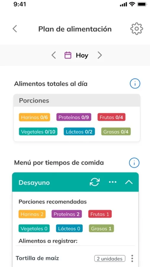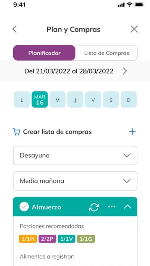 Te detallamos la cantidad de porciones recomendada para cada tiempo de comida y un ejemplo de los alimentos que puedes incluir para cumplir con tu plan. Podrás llevar el control de tu plan de alimentación registrando los alimentos que consumes en el día y configurando alertas para que no olvides registrar ninguna de tus comidas.