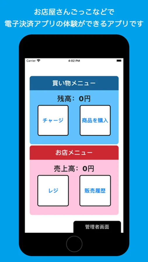 1人1台,iPad又はiPhoneがある環境で,お店屋さんごっこなどで電子決済アプリの体験ができるアプリです。買い物をする側のプレーヤーは,アプリに入れた通貨を使って,買い物をします。お店側のプレーヤーは,お客さんのQRコードを読み取ることで,売上が蓄積されていきます。