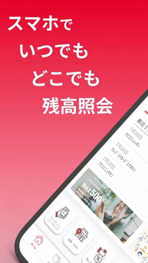 いつでもどこでもスマホで口座開設、口座の残高・入出金明細の確認ができます。