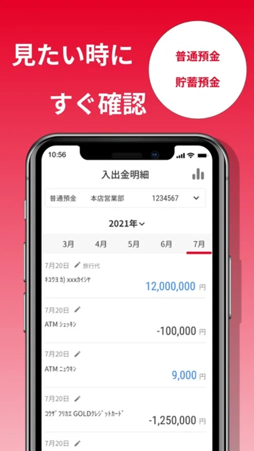 口座の残高や入出金明細をいつでも・どこでもご確認いただけます。明細に任意でメモを付けたり、残高推移をグラフ表示することもできます。