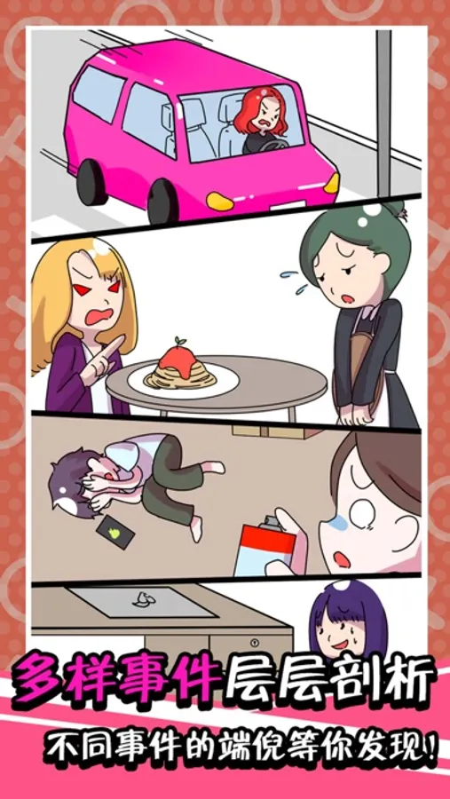 此时此刻事态非常严峻。所以...她到底有没有错?丰富多样的关卡无一都透露紧张和刺激,在不同的情况下该如何帮她脱身呢?——必须时刻保持清醒的头脑去推敲,通过观察思考后点击关卡画面来还原事件真相。在《不是她的错》中努力还给她一个清白吧!