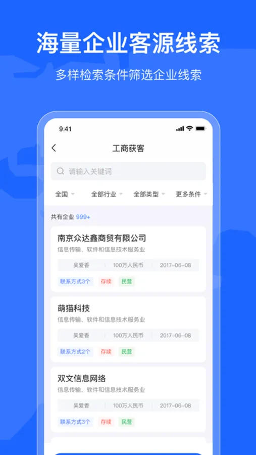 2.工商获客:通过工商大数据梳理,帮助用户淘选出潜在意向客户。