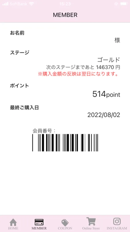 店舗で会員バーコードをご提示いただくとポイント付与・ポイント使用による割引等のどちらもご利用いただけます。