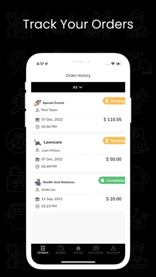 The app allows you to see past and upcoming services. Once the service request is complete, you will be able to leave reviews and ratings for your service provider.