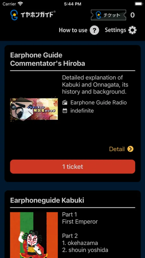 You can listen to the audio commentary while watching Kabuki, Noh, Kyogen, or contemporary plays.