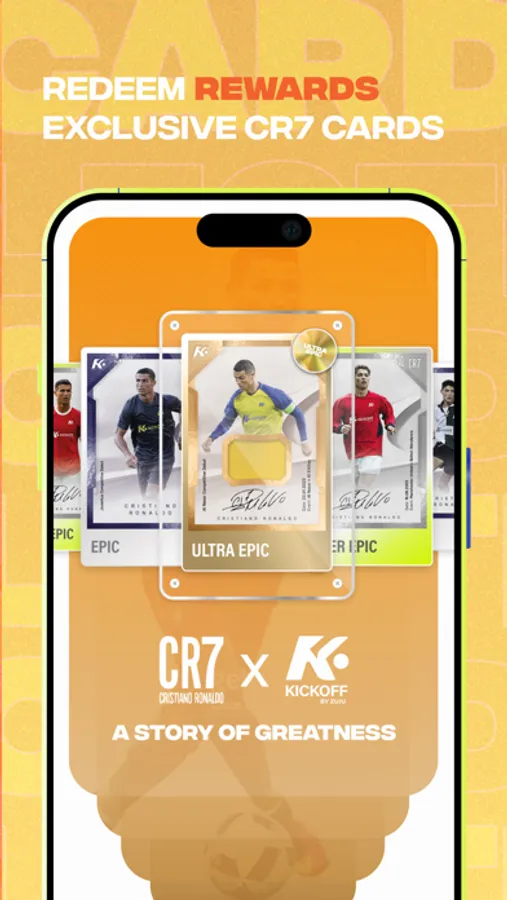 Use the Caps you have earned to redeem for our LIMITED EDITION, CRISTIANO RONALDO x KICKOFF BY ZUJU, COLLECTIBLE CARD COLLECTION, available exclusively only on Kickoff by Zuju! This one-of-a-kind collection, titled ‘Cristiano Ronaldo - A Story of Greatness’, features 100 unique collectible cards that tell the story of CR7. The entire collection, when put together, documents CR7’s professional career, and provides a first-hand inside perspective of how CR7 has embodied the drive to greatness and why he is greatness personified. Each card will represent a “page” in the story, and the cards will only be available for a limited time only - so don’t miss out!